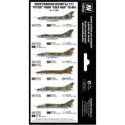 Estuche de colores Model Air desarrollado para pintar diferentes modelos del Sukhoi Su-7 “Fitter” y su modelo evolucionado o Su-17 de la Fuerza Aérea Soviética durante la “Guerra Fría”. Incluye perfiles de aviones, donde se indican los colores necesarios para pintar los esquemas de camuflaje y una descripción detallada de los mismos.